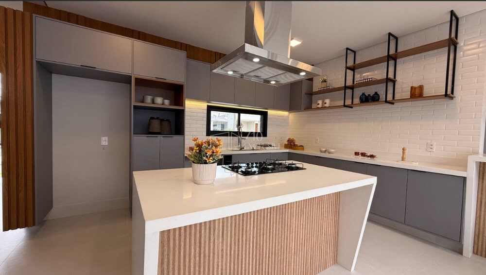 - Cozinha e área gourmet integradas com ilha central, cooktop, coifa e forno instalados;