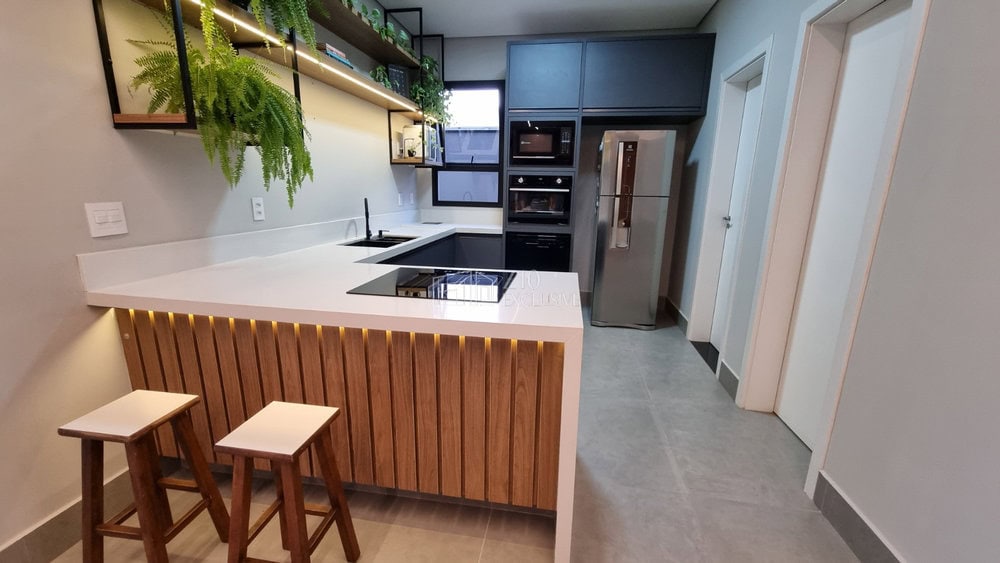 Cozinha americana com ilha em Quartzo branco e cuba dupla;