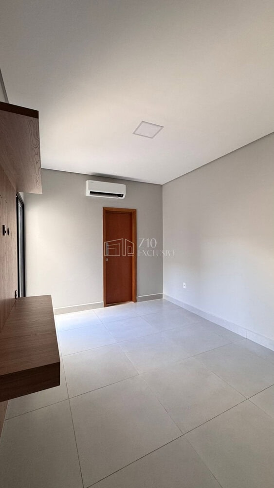 Suíte master com painel para TV, bancada, closet amplo e ar-condicionado de 12.000 BTU;