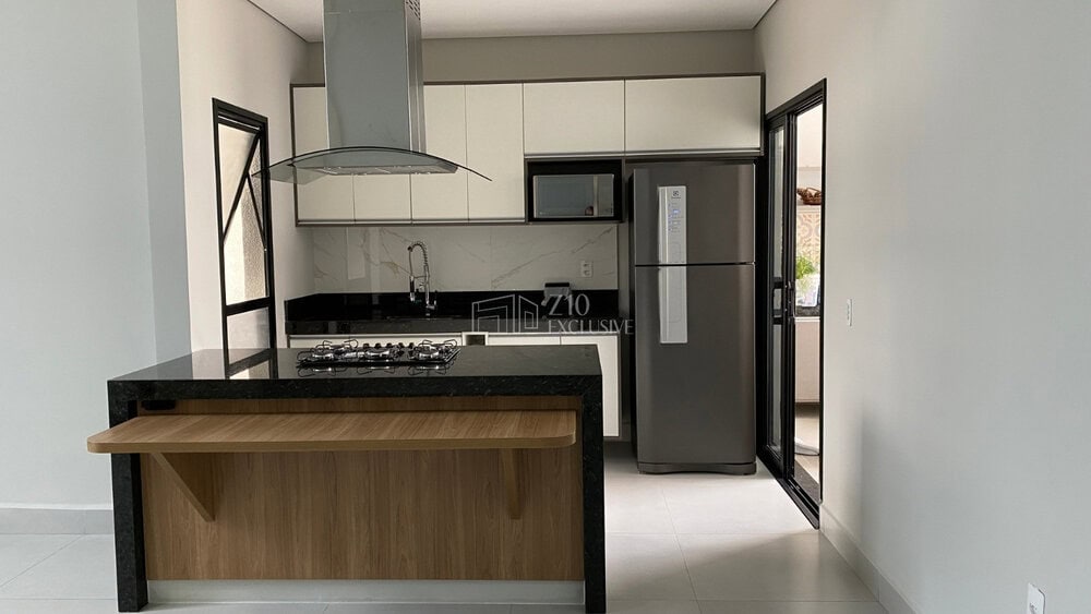 Ilha central com cooktop, forno elétrico, coifa e bancada para refeições;
